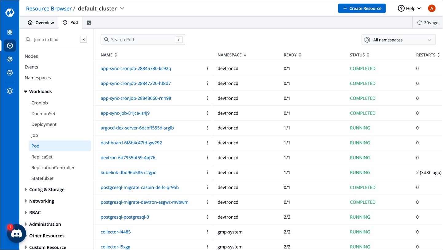 The Modern Kubernetes Dashboard by Devtron provides a unified interface for managing and observing all Kubernetes resources across your clusters. It simplifies resource management by offering visualizations, RBAC controls, multi-cluster support, thus making it intuitive for you to view and manage your microservices.