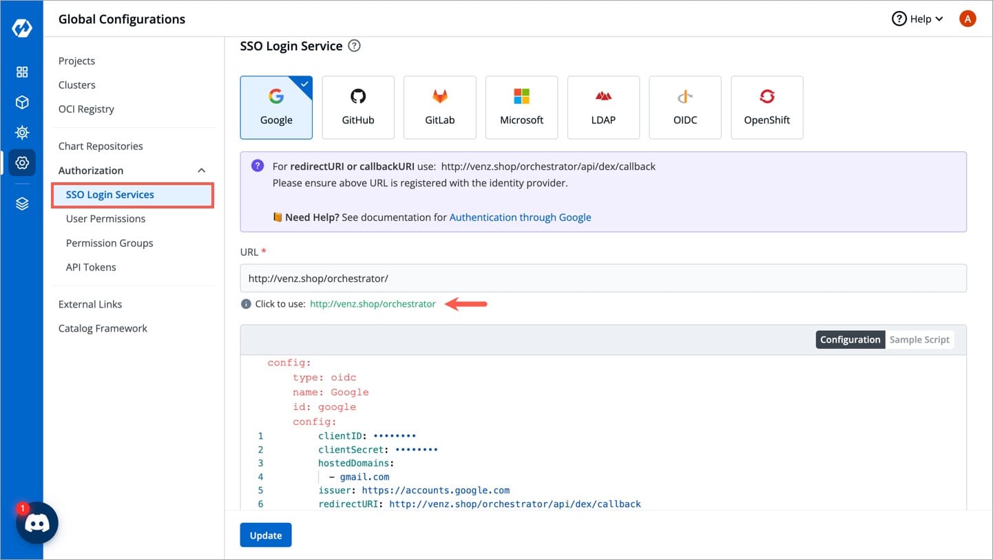 You can change SSO configuration anytime by updating the configuration and click Update. Note: In case of configuration change, all users will be logged out of Devtron and will have to login again.
