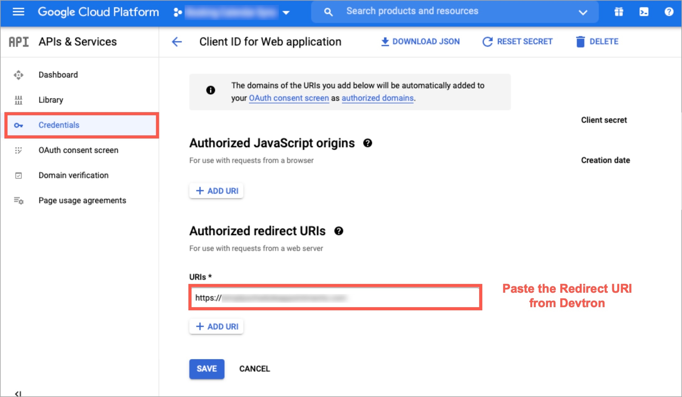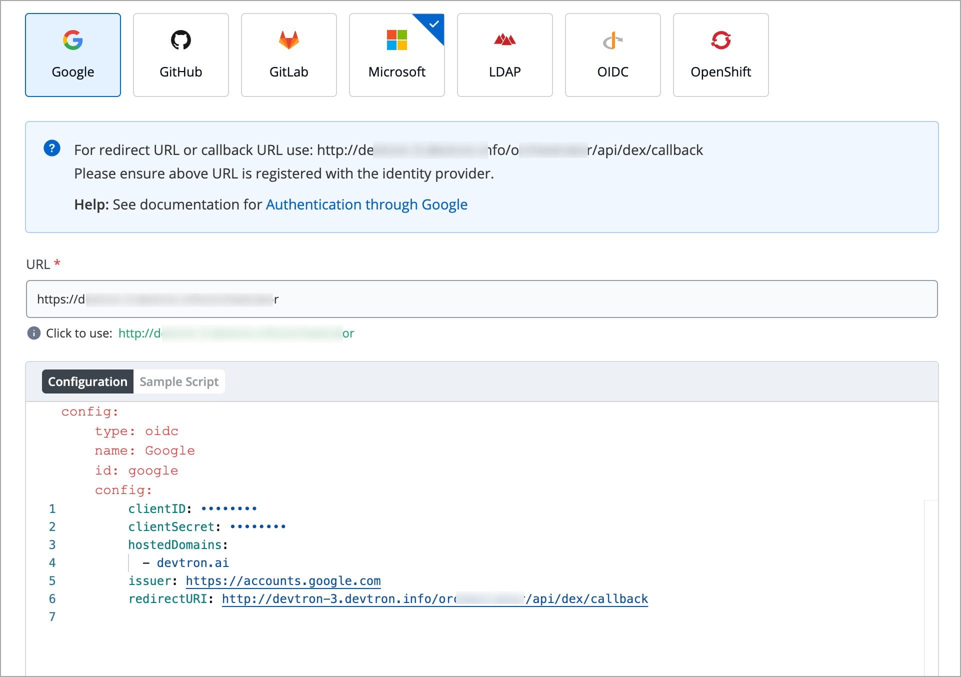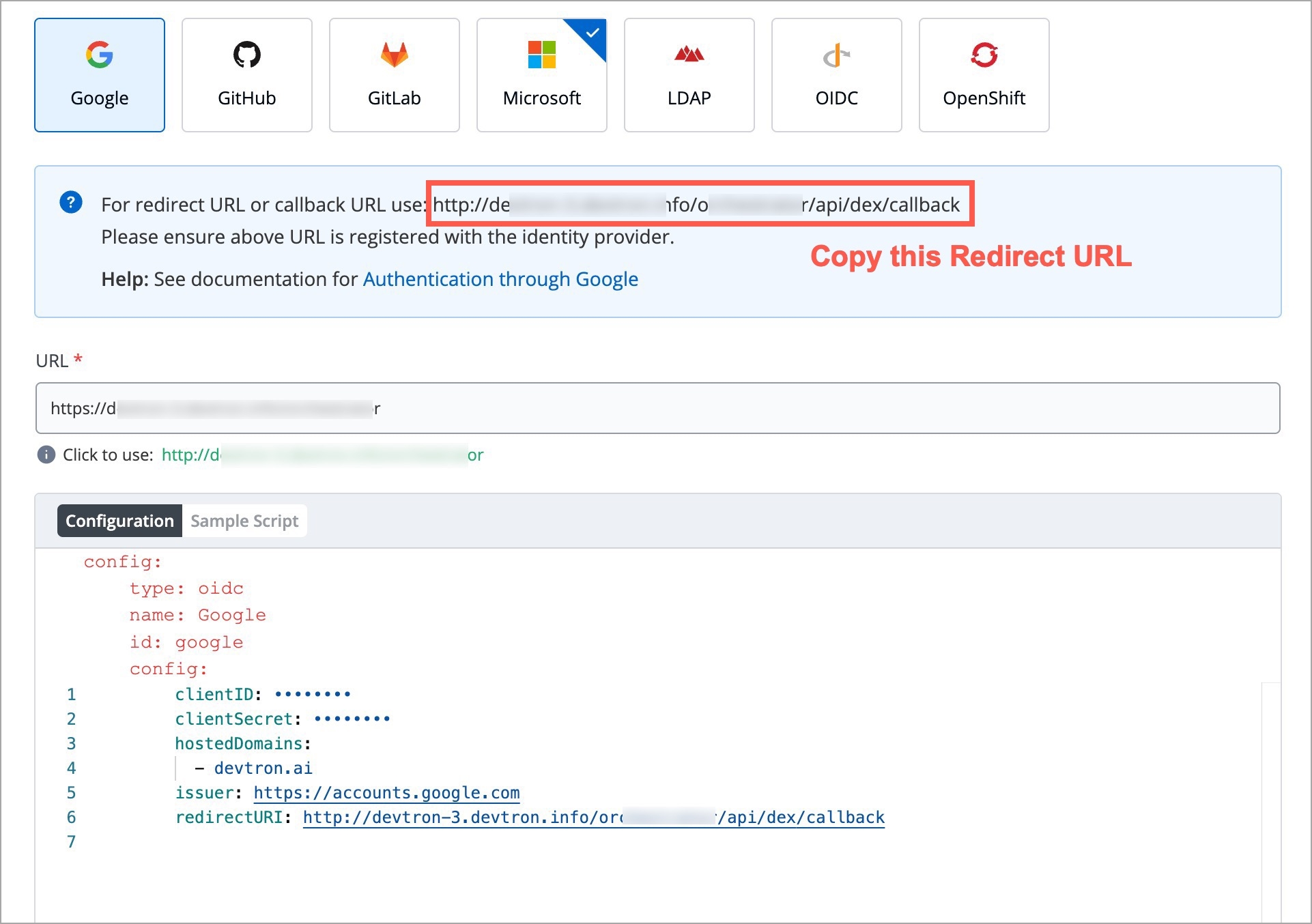 Copying Redirect URI from Devtron