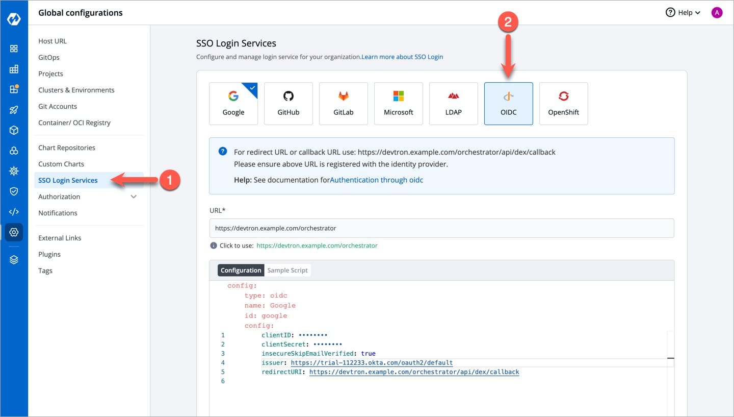 Now go to Devtron's Global Configurations → SSO Login Services → OIDC.