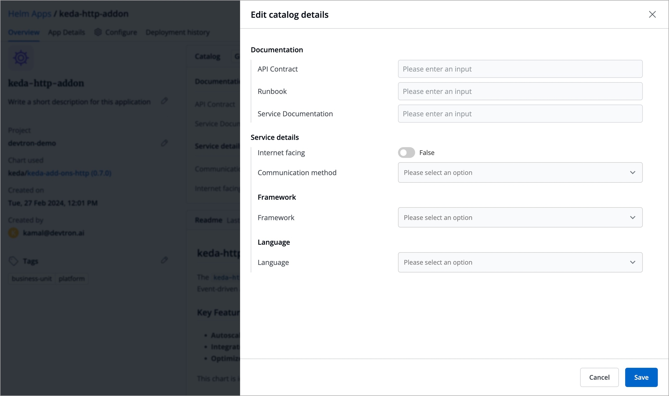 To achieve this, Devtron supports a feature known as Catalog Framework. Using this, you as a super-admin can decide the data you expect from the managers of different resource types. In other words, you can create a custom JSON schema that would ultimately render a form for the resource owners to fill. Once the form is filled, a GUI output will appear as shown below.