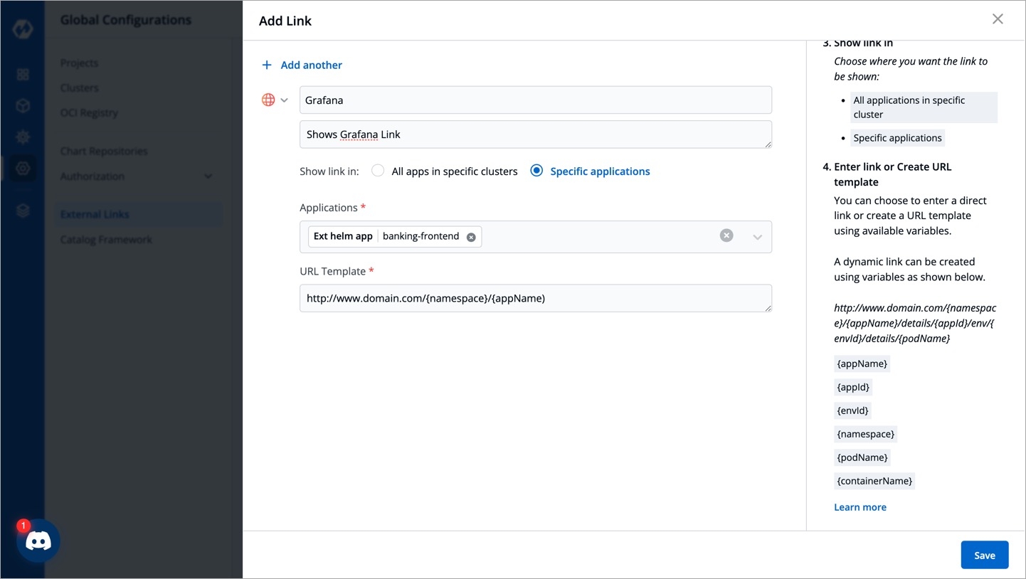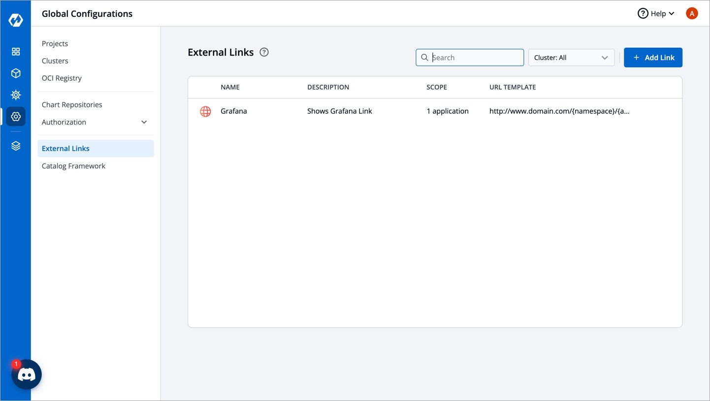 External Links allow you to connect to the third-party applications within your Devtron dashboard for seamlessly monitoring/debugging/logging/analyzing your applications. You can select from the pre-defined third-party applications such as Grafana to link to your application for quick access.