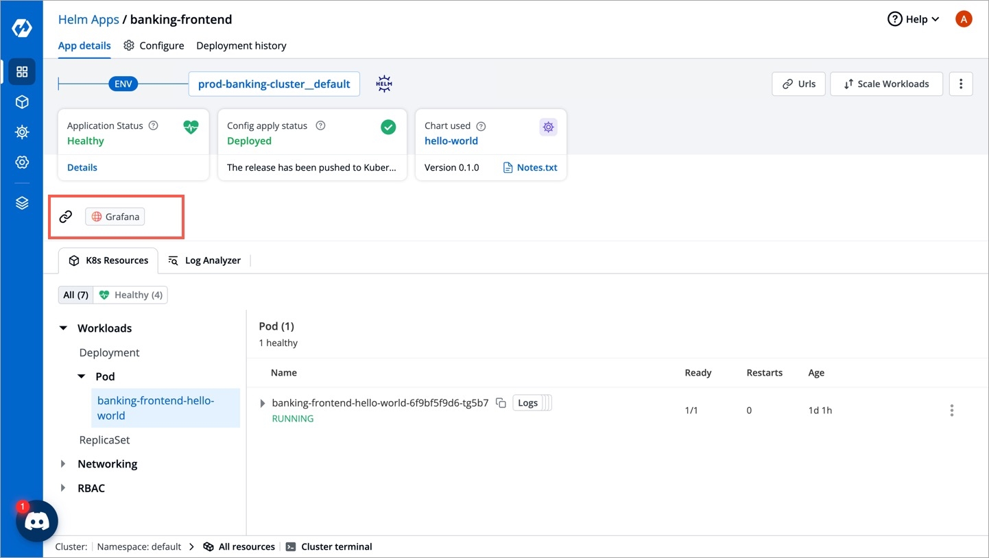 To monitor/debug an application using a specific Monitoring Tool (such as Grafana, Kibana, etc.), you may need to navigate to the tool's page, then to the respective app/resource page.