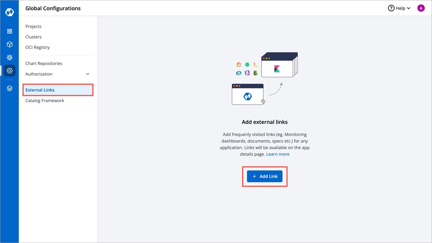 Note: External links can only be added/managed by a super admin, but non-super admin users can access the configured external links on the App Configuration page of Helm App.