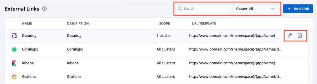 On the External Links page, the configured external links can be filtered/searched, as well as edited/deleted.