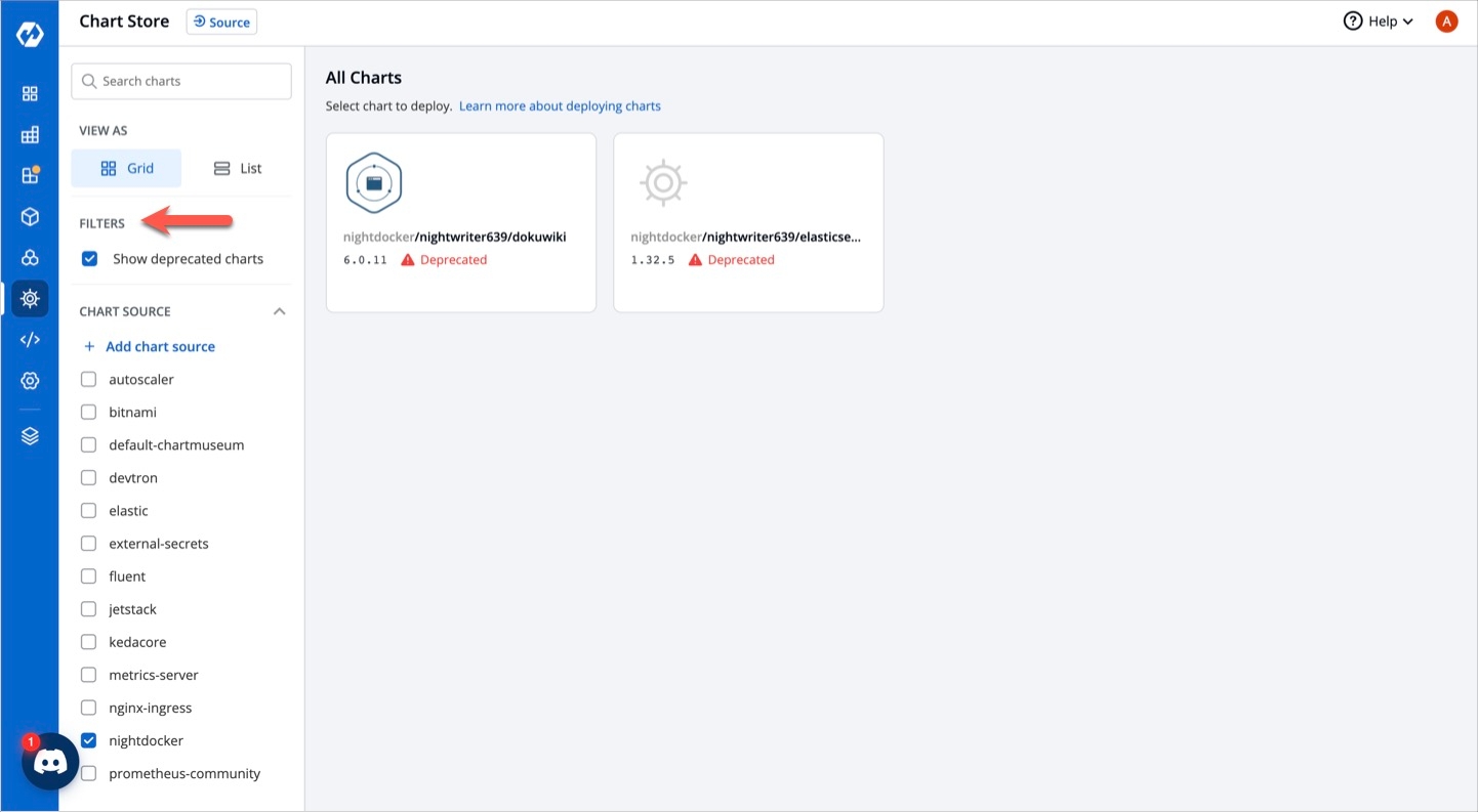 Deprecated charts won't show up in the Chart Store unless you enable the Show deprecated charts filter as shown below