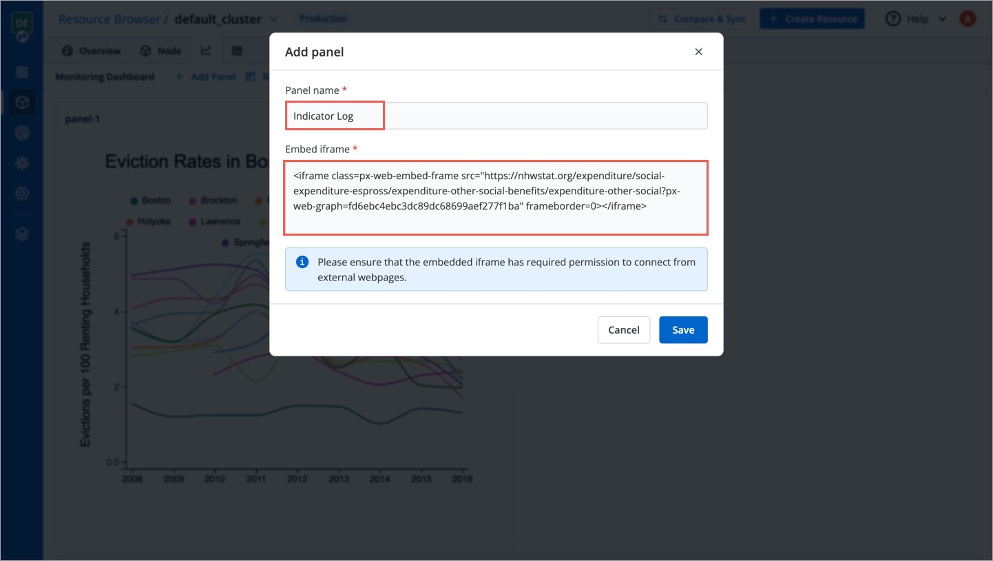 The Resource Browser allows you to integrate monitoring graphs and dashboards from tools like Grafana, Kibana, Prometheus, and many more tools, with each cluster. This centralizes all monitoring visuals for your clusters in one place within Devtron, streamlining troubleshooting and significantly reducing manual effort.