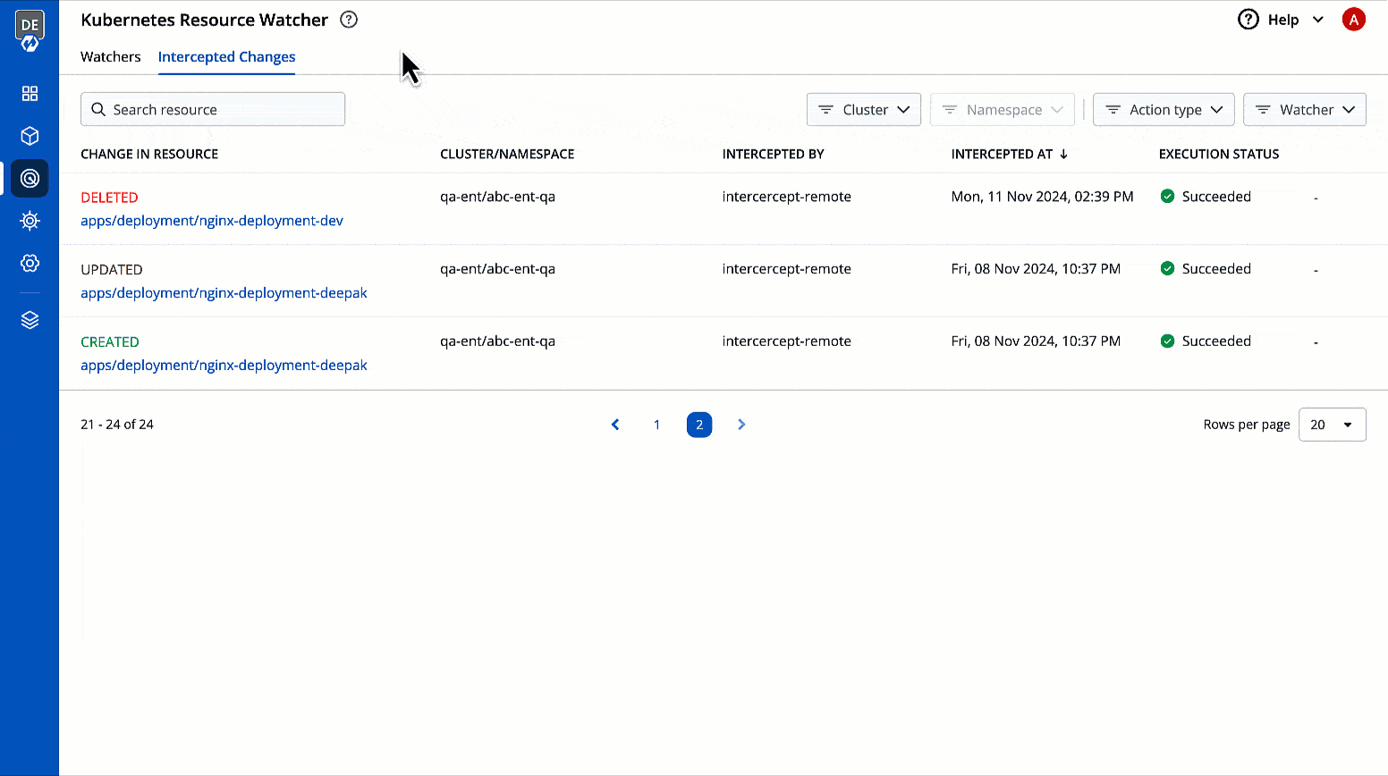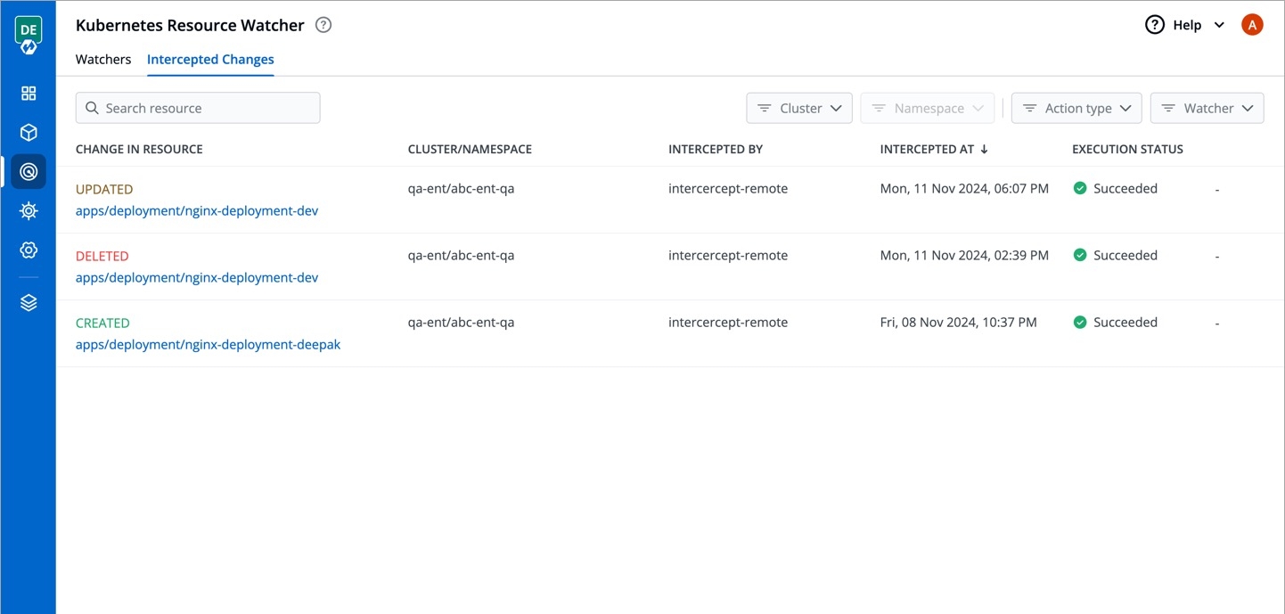 This page allows you to view the changes to Kubernetes resources that you have selected for tracking changes.